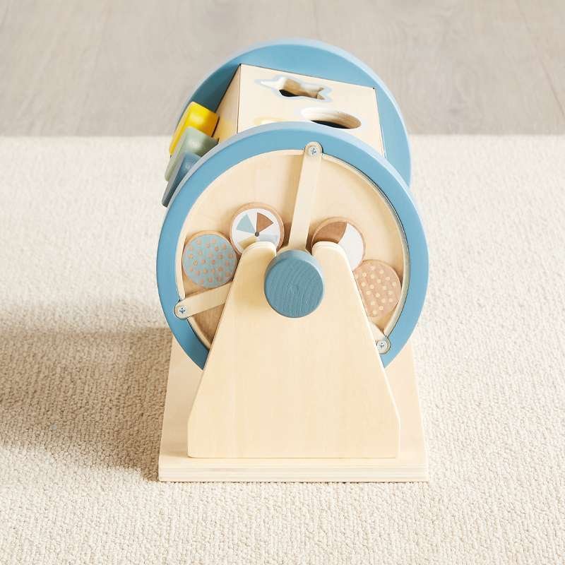 Your baby will rock and roll with our wooden Activity Roller.? This perfect tummy time toy can either sit in the base and whirl and twirl, or roll freely on the floor.? This quality interactive toy features a shape sorter with heart, star and circle shapes and a functioning door that opens to store and retrieve shapes , 3 noisemaking knobs, 3 graphic abacus blocks, and an acrylic mirror.? The sides of the cylinder boast floating discs enclosed in acrylic.? Our Activity Roller will stimulate all the senses during playtime!